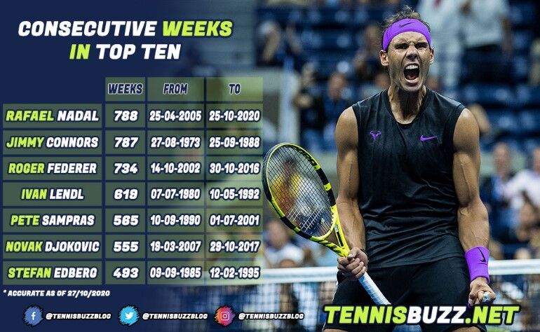 ナダルとうとうトップ10連続在位記録1位になったな