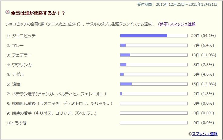 ジョコビッチ希望は錦織ですが、ジョコの全豪での強さを見たら選ばざるを得ない。ワウリンカ全豪では3年連続でジョコビッチと死闘を繰り広げてるので、そこさえ制すれば優勝すると思うマレー期待込みで。過去準優勝4回かな。そろそろ優勝できても良いでしょう錦織全米のリベンジでいきなり取ってほしい。