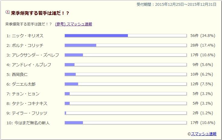 キリオスだと思う。将来絶対ランキング1位になると思う。理由は感情や気持ちの高ぶりをコントロールを出来て押さえることができれば沢山勝てると思う。それにまだまだ伸びしろがあるからGS10勝とMS14勝位できる思う。コリッチはメンタルが弱そうだ