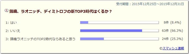 いいえ戦国時代が来るいいえ錦織もラオニッチも怪我がち。ディミトロフも今年を見ると、安定した成績は残せないのかなと。誰かしらは覇権を握るかもしれないけど、3人ともは考えにくい。錦織ラオニッチのTOP2時代ならあると思うディミトロフはさすがに安定感なさすぎだし、錦織と戦ってる時もラオニッチと比べたら全く怖くない。