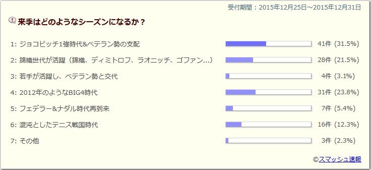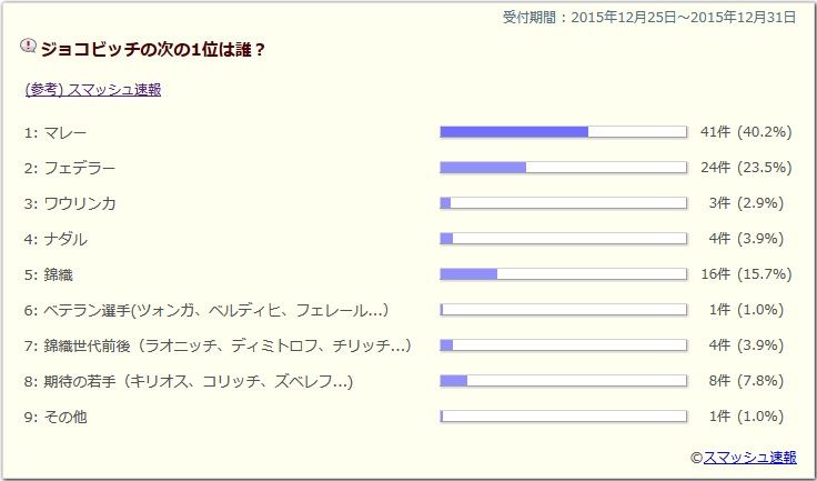 ジョコビッチ1強時代&ベテラン勢の支配2015年と同じような感じになりそう…錦織世代が活躍(錦織、ディミトロフ、ラオニッチ、ゴファン...)2014年みたいに錦織、ディミトロフ、ラオニッチ、チリッチあたりがキリオスも含めてGSでベスト8、ベスト4と大活躍を期待。コリッチ、ズベレフなどの20歳未満の若手はまだ来年では開花しないと思う2012年のようなBIG4時代ナダルの復活 マレー、フェデラーの衰えなさ ジョコの無双 他選手が入る隙がないフェデラー&ナダル時代再到来希望です!