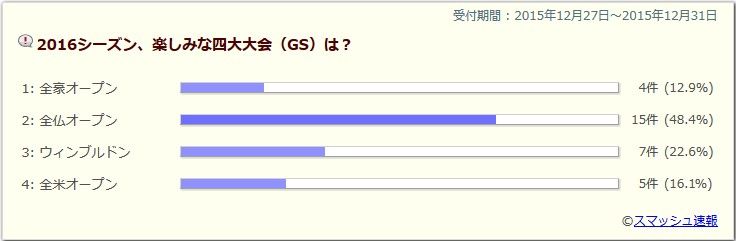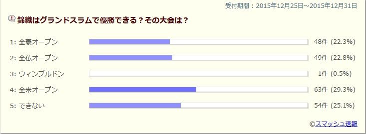全仏オープンラリーが比較的長く続く全仏は錦織に最も適していると思ったから。他のサーフェスよりも確実にチャンスがある。全仏オープン全豪か全仏で迷いましたが、ここ最近のクレーでの活躍を見て決めました。全米は夏場弱いからちょっと…。ウィンブルドンは…。全米オープンすぐには無理だろうけど必ずできる、してほしい。可能性的には全米じゃないかな。全豪オープン全豪のコートが彼に1番合ってると思います。頑張れ圭!!