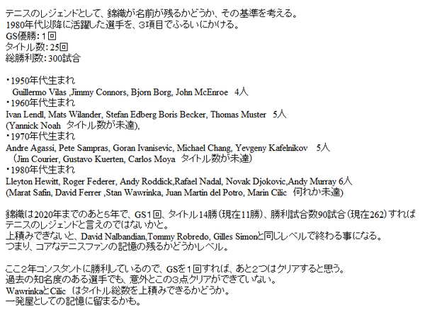 MS1勝、年末トップ10(できれば最終戦出場)を5回、マッチ500勝は達成してほしいなぁ>錦織