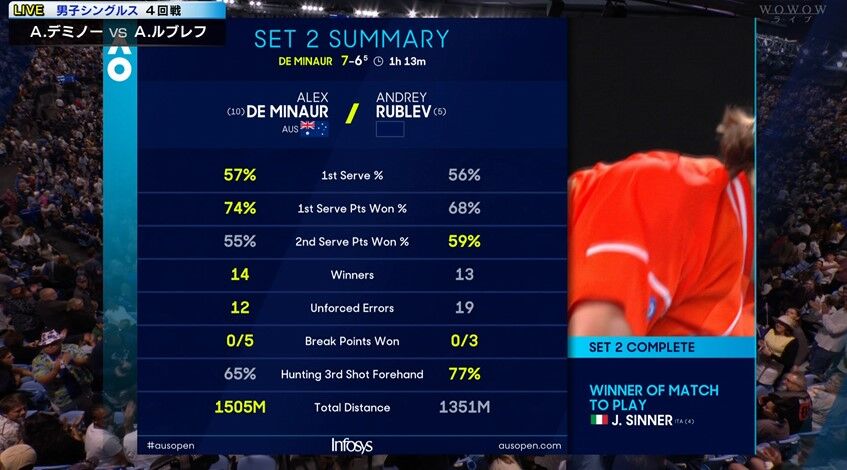 デミノー去年の全豪の名珍場面集ではネット際でラケット折る姿が採用されてたがマジで惜しいシーンだったので解説もこれはしゃーない折っちゃうのも仕方ないという空気だった